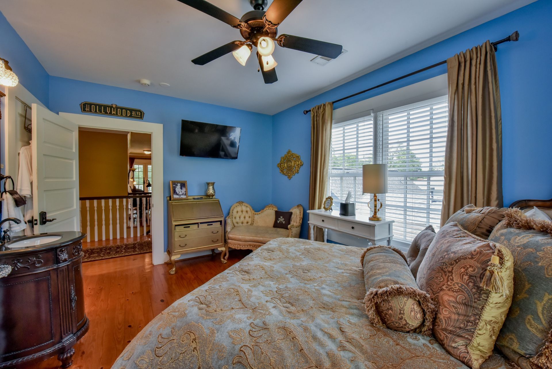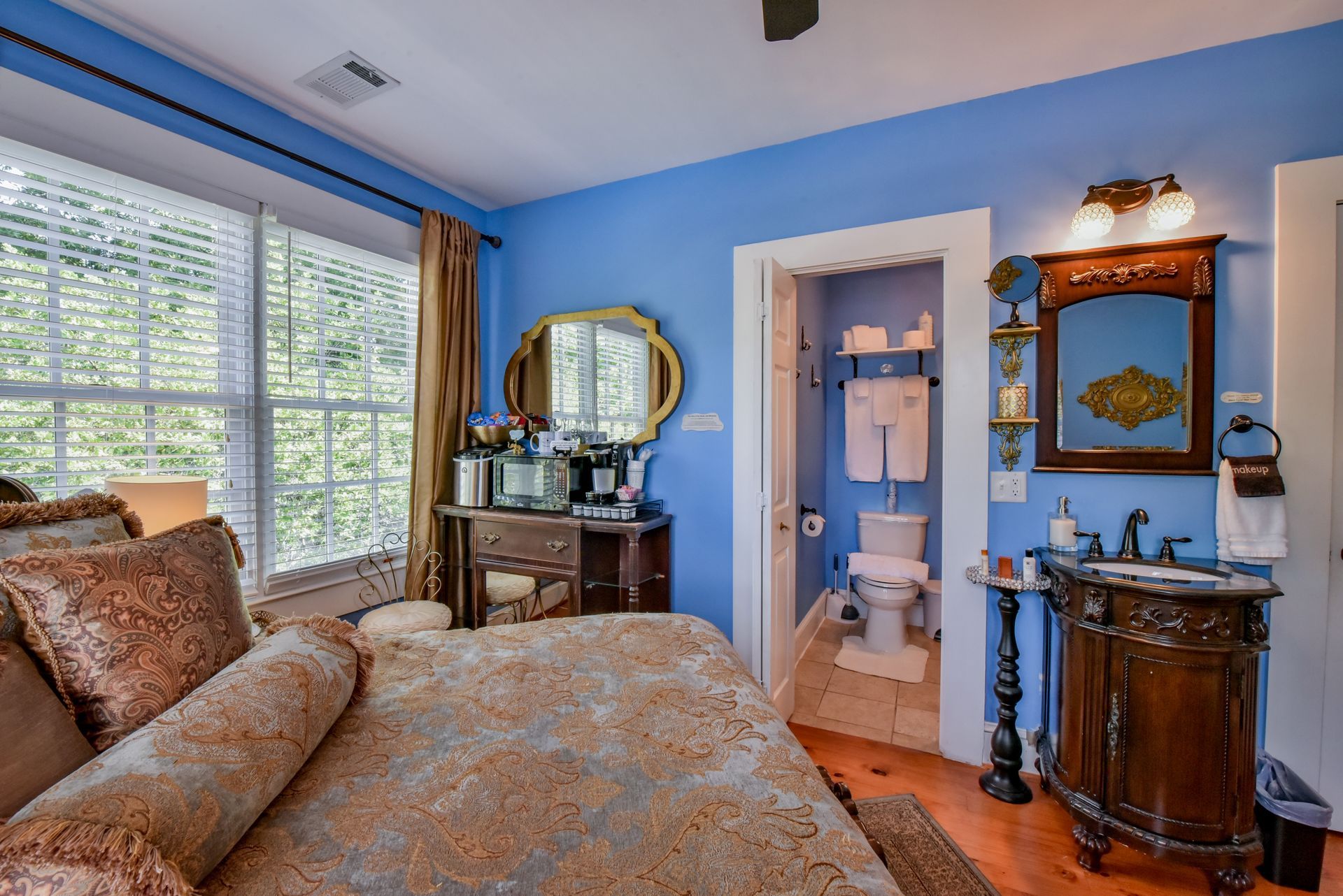 Queen bed with a sink in the bedroom and a private bathroom with a tub shower.